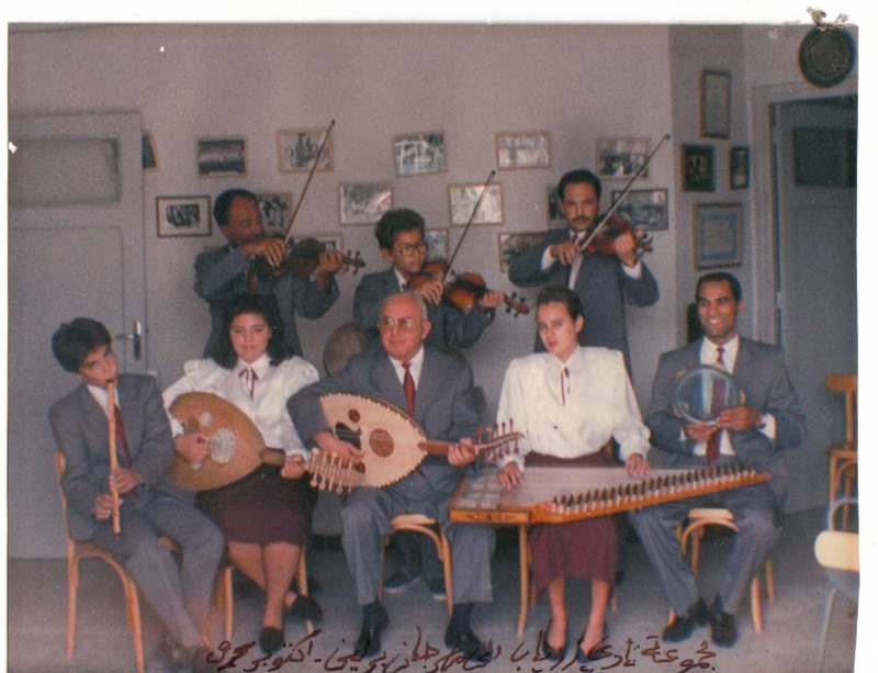 El profesor Salah El Mahdi aparece en el centro; a su lado, su nieta Sirine, seguida de su nieto Fares. A su izquierda, una de las jóvenes del club toca el qanún. Detrás de él, en el centro, su nieto Kais. A la derecha, el Sr. Anouar Cherfi.
