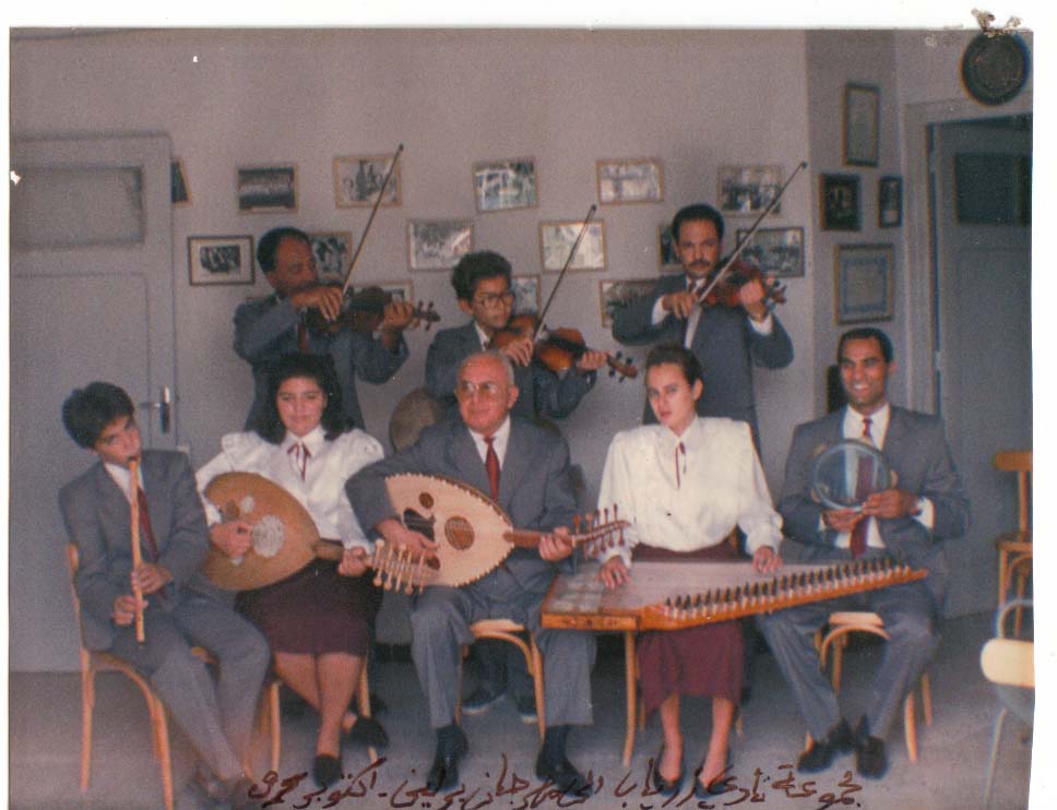 On voit le professeur Salah El Mahdi au centre, à ses côtés sa petite-fille Sirine puis son petit-fils Fares. À sa gauche, l’une des jeunes du club joue du qanûn. Derrière lui, au centre, son petit-fils Kais. Sur la droite, M. Anouar Cherfi.