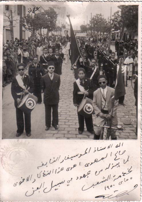 صورة مهدات للأستاذ صالح المهدي من المرحوم فرحات حشاد // يعد فيها قبل شهر مجموعة صوتية ممتازة من الشغالين برفقة طواقم الموسيقى النحاسية بتونس العاصمة