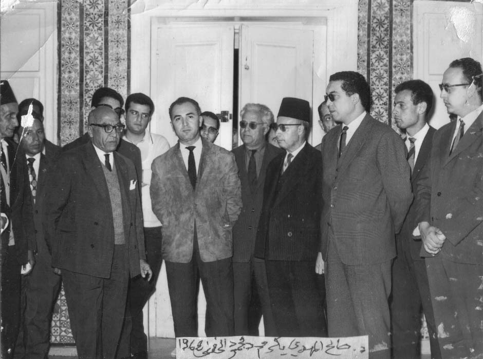 El profesor Salah El Mahdi y, a su derecha, el Sr. Abdelhakim Abdel Jawad (Jefe de Gabinete del Ministro de Cultura), el Sr. Chedly Klibi, el Sr. Habib Al-Amri y el Sr. Hamah Al-Triki. A la derecha del profesor Salah El Mahdi está el Dr. Hefny.