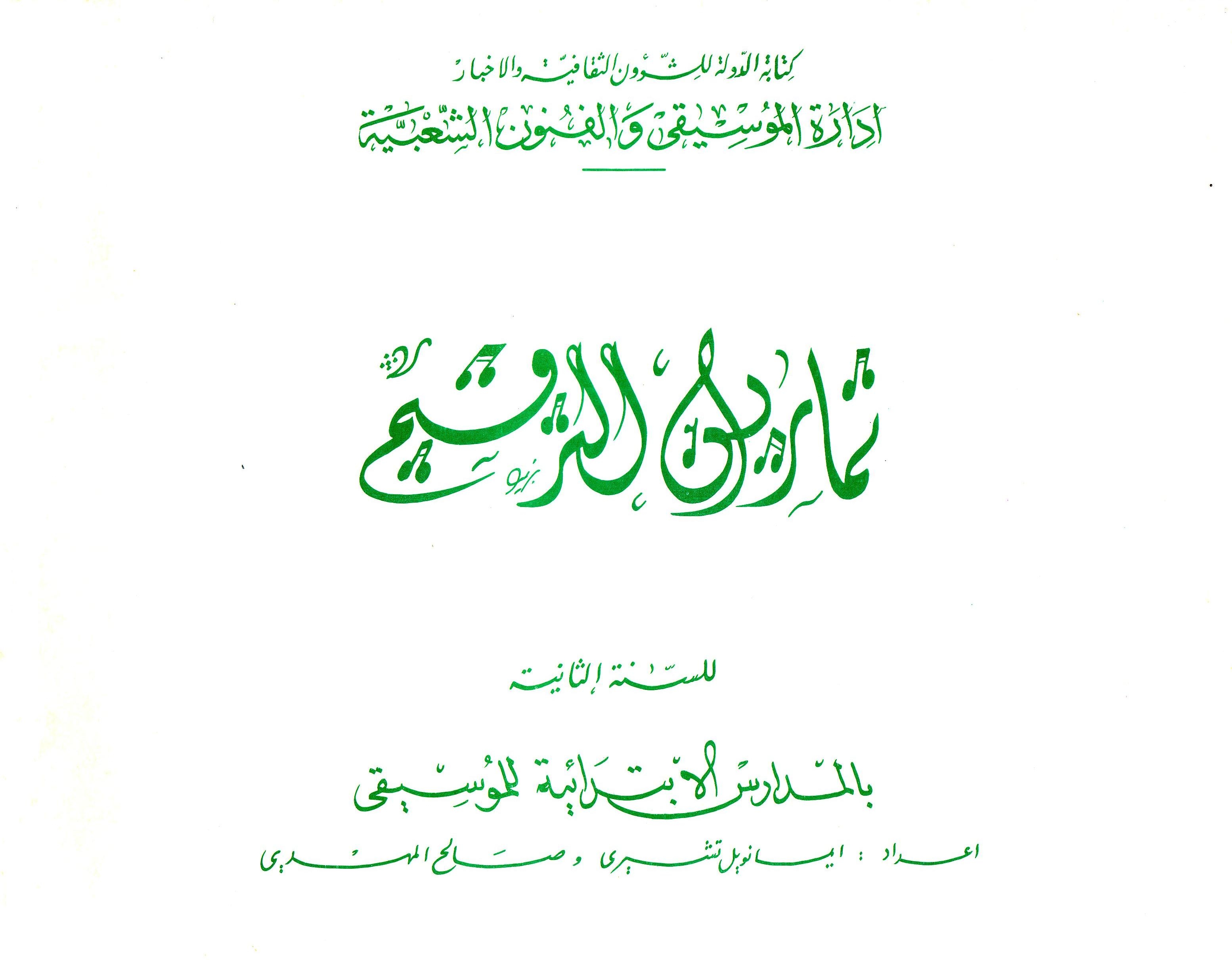 Libro de texto (preparado conjuntamente por los profesores Emmanuel Cherri y Saleh Mahdi) que incluye lecciones de canto y ejercicios de ritmo para los estudiantes de segundo año de la escuela primaria de música.