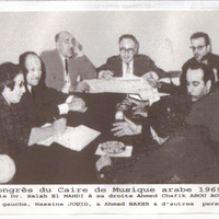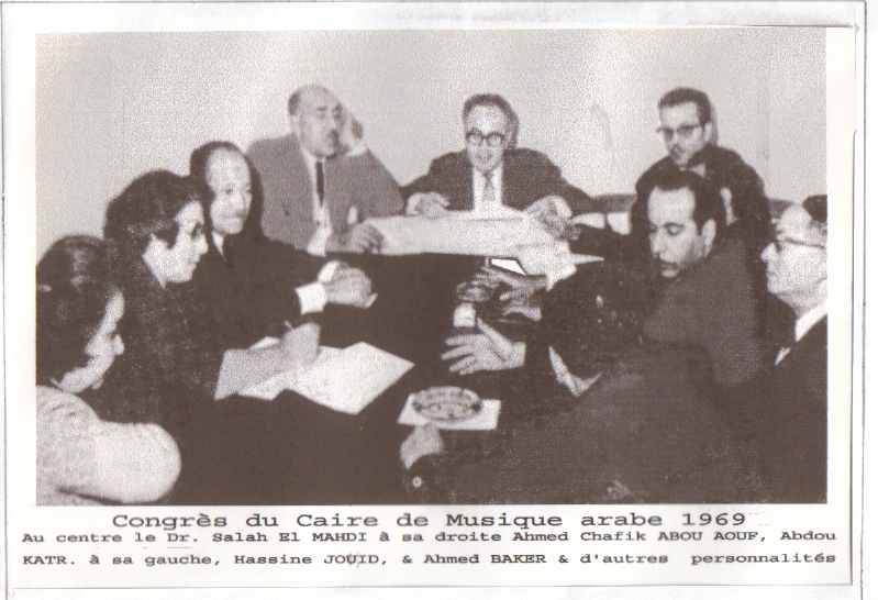 - الأستاذ صالح المهدي على يمينه السيد أحمد شفيق أبو عوف/ ملحن قديم // على يساره حسين جنيد/ أحمد باقر/ أمين ملحن من مصر
