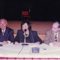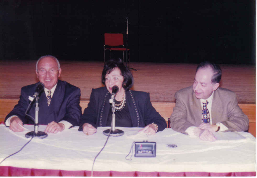 الأستاذ صالح المهدي على اليمين // الدكتورة رتيبة الحفلي مديرة المهرجان // الدكتور سعد آغا القلعة وزير السياحة السوري