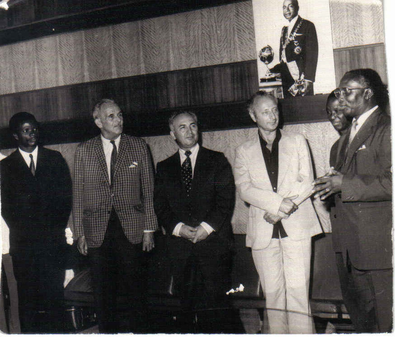 متوسطهم الأستاذ صالح المهدي و على يمينه مندوب من أمريكا و على يساره الأمين العام للمنظة